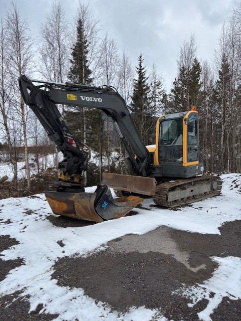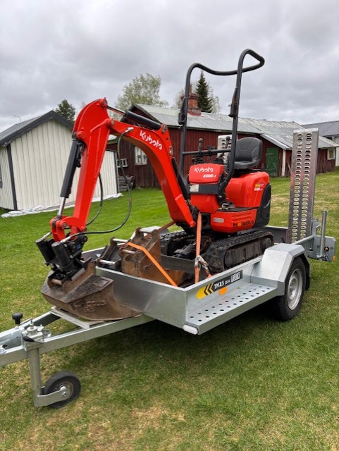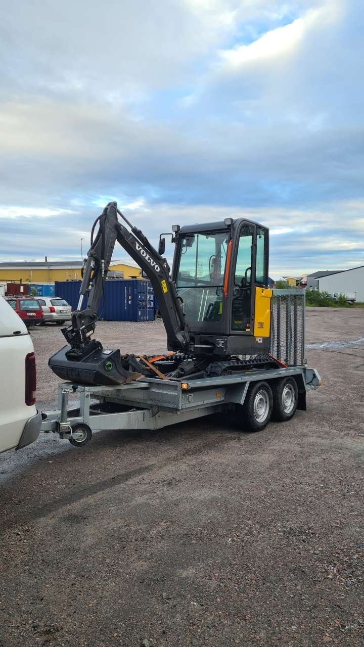 Maskinvikt 1,8 ton, hydrauliskt tiltfäste, 3 skopor, breddbara larver, trailer 2700kg, brandbesiktigad, endast 2,35m hög, 1m bred.